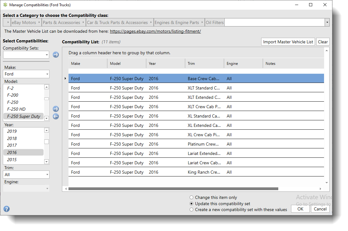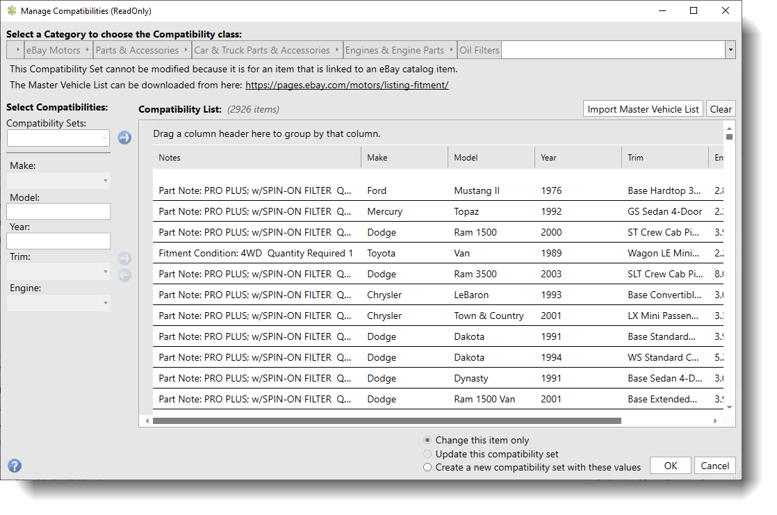 Unlike as described earlier in To_create_a_compatibility_set_from_scratch:, additional compatibilities cannot be added or removed from fitments downloaded from the eBay catalog.
