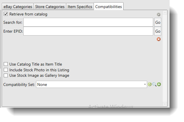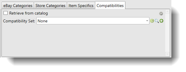 - After selecting a category that supports parts compatibilities on the Edit Item window, the Compatibilities Tab will appear. Initially, the Compatibility Set drop down will have None selected to indicate that the compatibilities have not yet been entered.