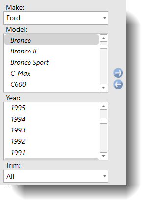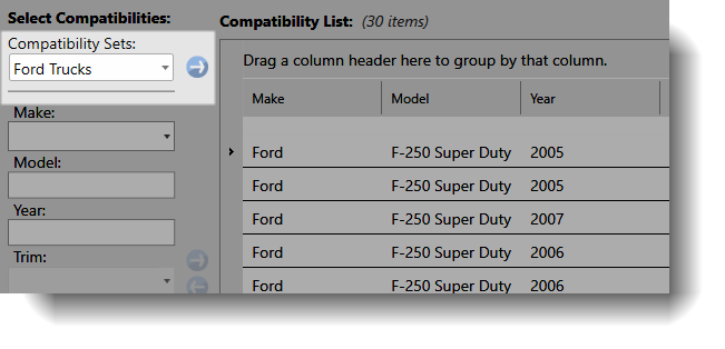 For any additional entries, choose a value for each of the compatibility fields. In this case, Make/Model/Year/Trim/Engine. Note that in the Year selection, multiple entries can be selected by using Shift-Click or Ctrl-Click. When finished, click the right arrow next to the fields to add them to the list.