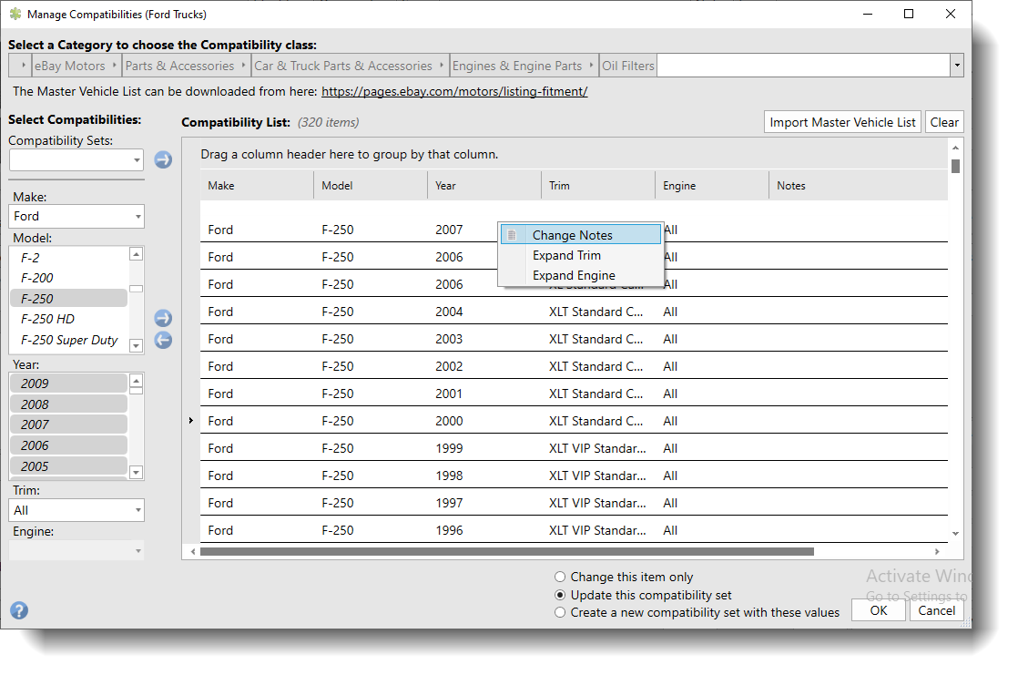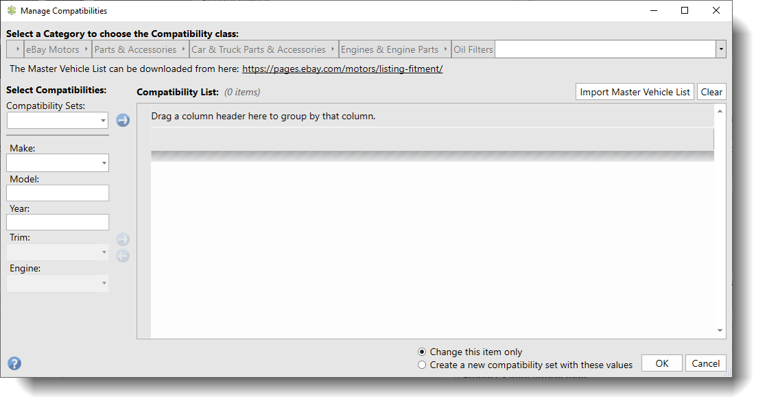 If called from an item, the category chosen on the item will appear in the "Select a category..." drop down. This will determine the compatibility fields that will be available to fill in (i.e Make/Model/Year/Trim/Engine). If the editor was opened from the Manage Compatibilities window, the category needs to be specified.