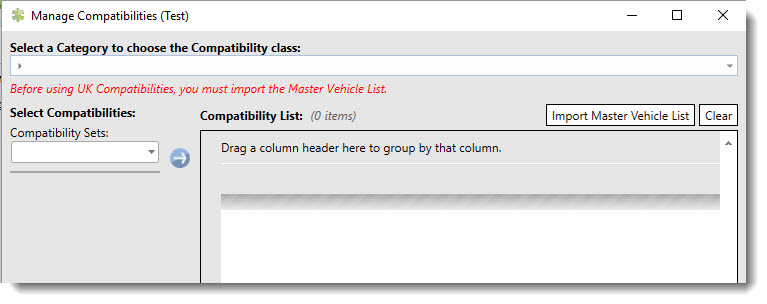 - If you have not previously imported an MVL, then you will see the "It is recommended that you import the Master Vehicle List for the U.S. Site.", or "Before using UK Compatibilities, you must import the Master Vehicle List" message. Whether you have imported the list or not, you can also import a new one by clicking the Import Master Vehicle List button.