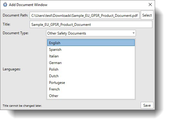 . - On the Add Document Window click Select to choose the file on your computer. Choose PDF when possible. for safety or EPR documents, then enter a descriptive Title, choose the appropriate Document Type, select the Language and click Save.