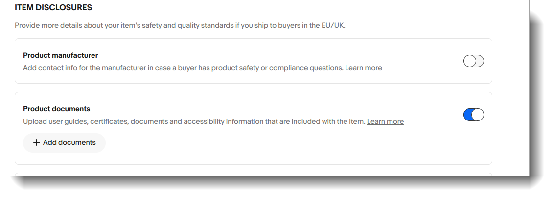 If you are also attaching product documents, keep in mind that eBay controls whether those documents actually render to buyers through a per listing setting in Seller Hub. In eBay Seller Hub, do a one time bulk edit to flip Product documents to ON by going to Listings, selecting the affected listings, choosing Bulk edit, then Item disclosures, then Product documents, then Change to, then enabling the documents area and saving.