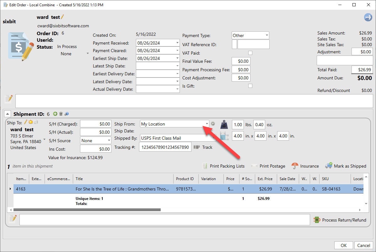 When adding inventory to your items, specify the warehouse location on the purchase record so that SixBit can determine from which warehouse the inventory should be pulled.