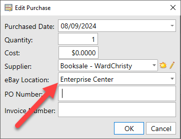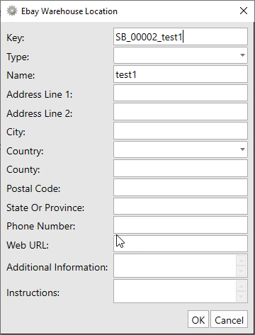 4. Fill in the eBay warehouse location, ensuring that all required fields are completed. The key field is mandatory. Click OK to save.