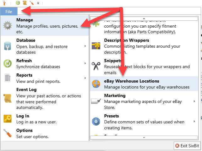 1. Open the File/Application Menu (the File button or little orange guy in the top left corner of SixBit) > Manage > eBay Warehouse Locations. Each warehouse is specific to each seller account, so you will need to add a warehouse for each seller account that will use it.